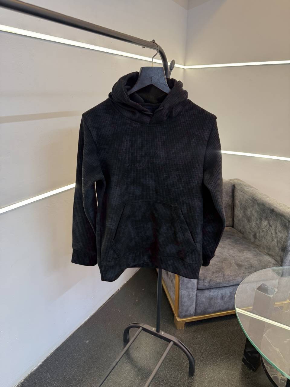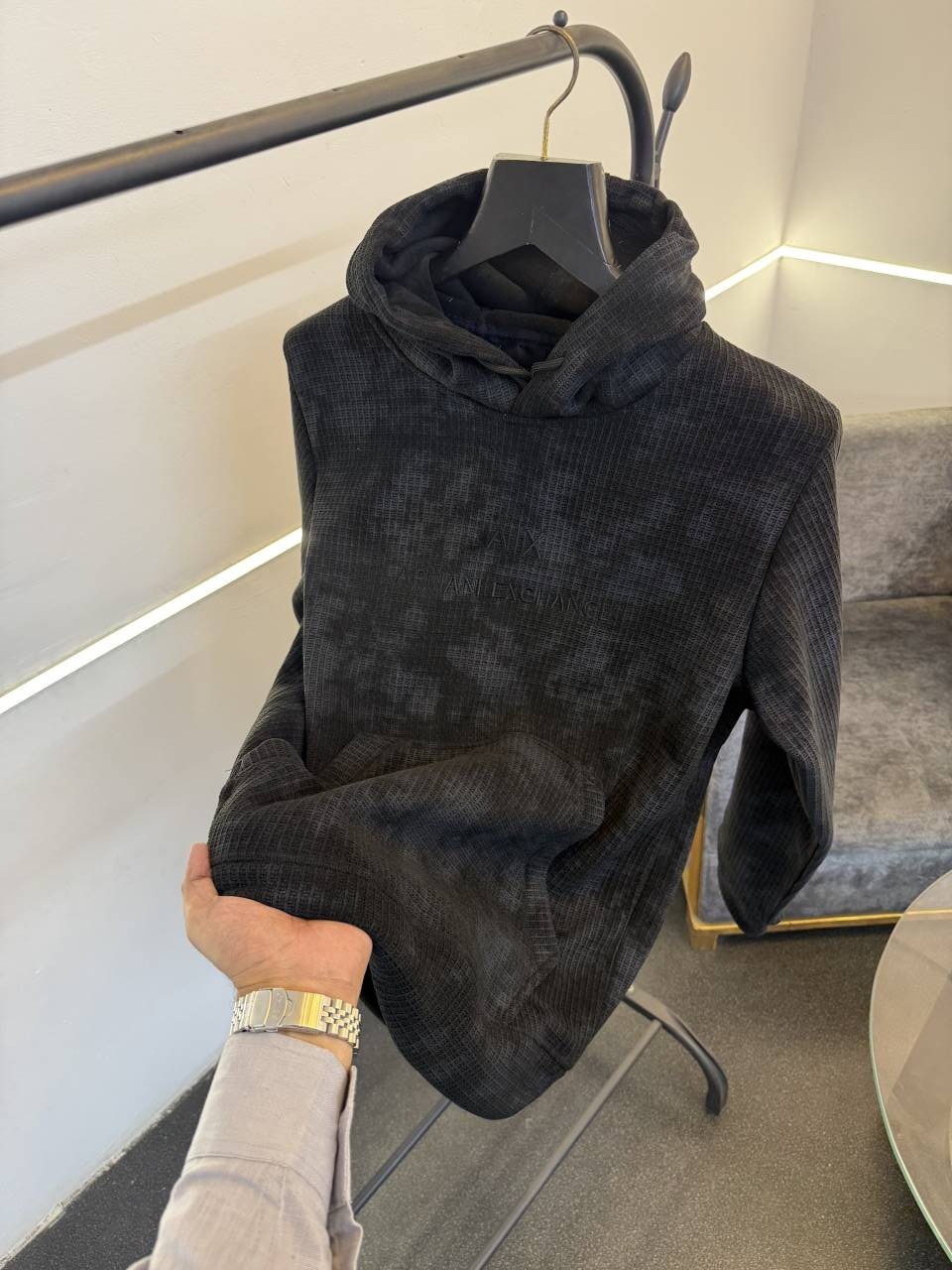 ? *Armani exchange knitted hooded sweatshirt with spray print and embroidery brand print on front now in stock*?